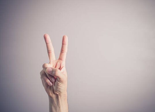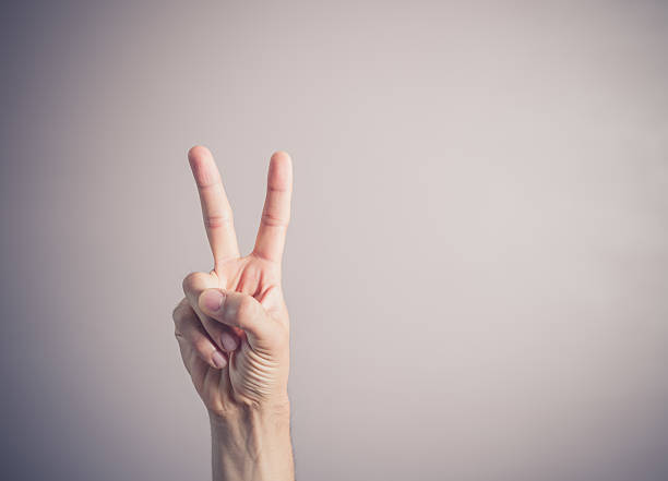 A male hand is displaying the victory sign