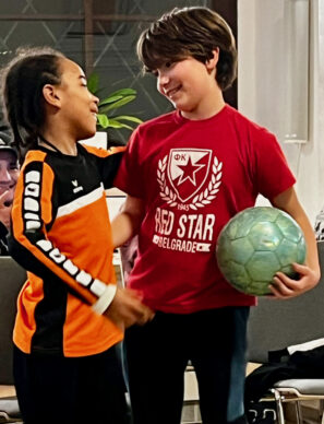 VCC 2024 retreat – Saturday night sharing – indoor football demo by Kite Bernroider (in orange) and Jovan Grujic (in red) – 4